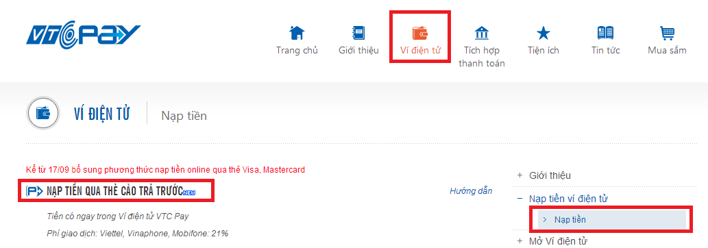 Bước 2: Chọn chức năng Ví điện tử/ Nạp tiền/ Nạp tiền qua thẻ cào trả trước