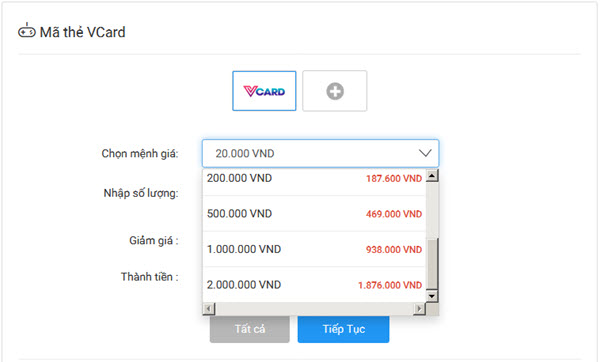 Bước 2: Chọn mệnh giá, số lượng mã thẻ Vcard muốn mua