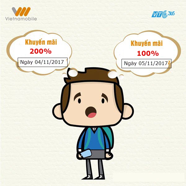 Hãy sẵn sàng chào đón một cuối tuần thật vui, thật sung với khuyến mãi 200% giá trị thẻ nạp ngày 04/11 và 100% giá trị thẻ nạp ngày 05/11 đến từ nhà mạng Vietnamobile! Tặng thêm tới 6,7% khi nạp tiền điện thoại Vietnamobile qua VTC365 nữa! Đừng bỏ lỡ nhé các bạn!