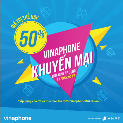 - Tặng 50% giá trị các thẻ nạp trong thời gian khuyến mại, trong đó: 25% giá trị thẻ nạp được tặng cộng vào Tài khoản Khuyến mại (gọi/nhắn tin liên mạng), 25% giá trị thẻ nạp được tặng cộng vào Tài khoản Khuyến mại 2 (gọi/nhắn tin nội mạng Vinaphone và cố định VNPT).
