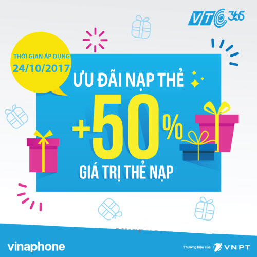 Chương trình khuyến mãi 50% giá trị thẻ nạp Vinaphone ngày 24/10/2017 đem đến cho tất cả các thuê bao Vinaphone trả trước cơ hội nâng cao số dư tài khoản cho dế cưng với những khoản chi phí tiếp kiệm nhất, nạp thẻ ngày vàng để gia tăng tài khoản hoạt động mà bất cứ thuê bao nào cũng không bỏ lỡ mỗi tháng.