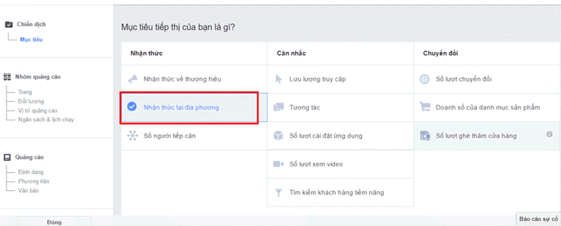 Bước 1: Trong trình tạo quảng cáo chọn mục tiêu chiến dịch “nhận thức tại địa phương”