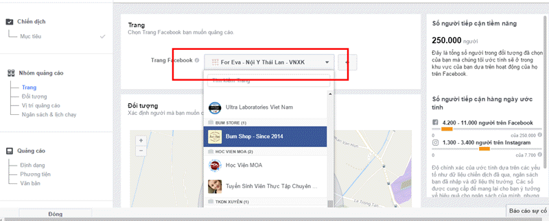 Bước 2: Chọn page bạn muốn chạy quảng cáo.