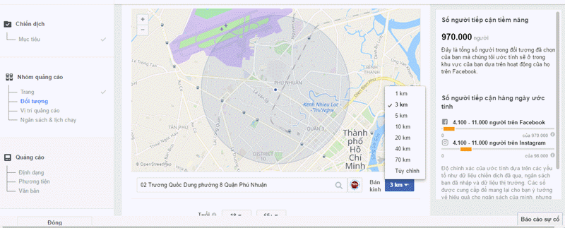 Tuy nhiên, phải để khách hàng biết đến quanh khu vực họ sống có cửa hàng của bạn thì khách hàng mới quan tâm và có khả năng mua sản phẩm của bạn cao hơn. Hiện nay, trình quảng cáo Facebook đã hỗ trợ nhà quảng cáo tiếp cận những khách hàng quanh bạn (local awareness Facebook Ads) với bán kính tối thiểu 1 km. Điều này hoàn toàn có lợi so với trước đây, Facebook chỉ cho bán kính tối thiểu là 5km trong tính từ cửa hàng của bạn.