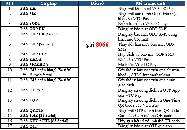 Từ ngày 25/10/2017, các dịch vụ của VTC Pay sẽ sử dụng duy nhất đầu số 8066, các đầu số khác đều bị hủy bỏ.