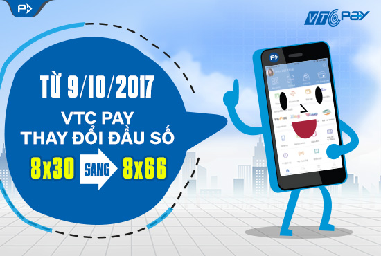 Từ hôm nay, 2/10/2017, VTC Pay sẽ thay đổi đầu số nhắn tin tới Quý khách hàng từ 8x30 (8730, 8030) sang đầu số 8x66 (8066, 8766). Việc thực hiện thay đổi đầu số này sẽ không làm ảnh hưởng hay gián đoạn hoạt động của Ví điện tử, Cổng thanh toán VTC Pay hay hoạt động thanh toán trực tuyến tại VTC365.