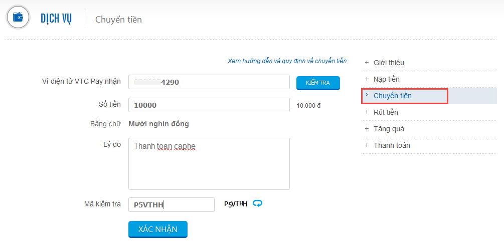 Giao dịch chuyển tiền giữa các tài khoản trên cùng hệ thống VTC Pay hoàn toàn miễn phí.