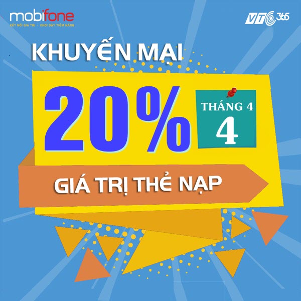 Chương trình khuyến mãi Mobifone ngày vàng 4/4/2018 tặng 20% giá trị thẻ nạp được áp dụng triển khai trên phạm vi toàn quốc với ưu đãi tặng đến 20% giá trị thẻ nạp cho tất cả các thuê bao Mobifone trả trước. Bên cạnh đó, VTC365 tặng bạn 5% mỗi mệnh giá thẻ nạp. Nhân cơ hội này, quý khách hãy gia tăng tài khoản cho dế yêu để thoải mái hơn trong việc tiêu dùng những ngày sắp tới.
