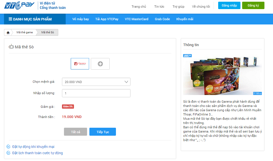 VTC Pay. VTC Pay là đối tác phân phối mã thẻ chính thức của Garena. Khi