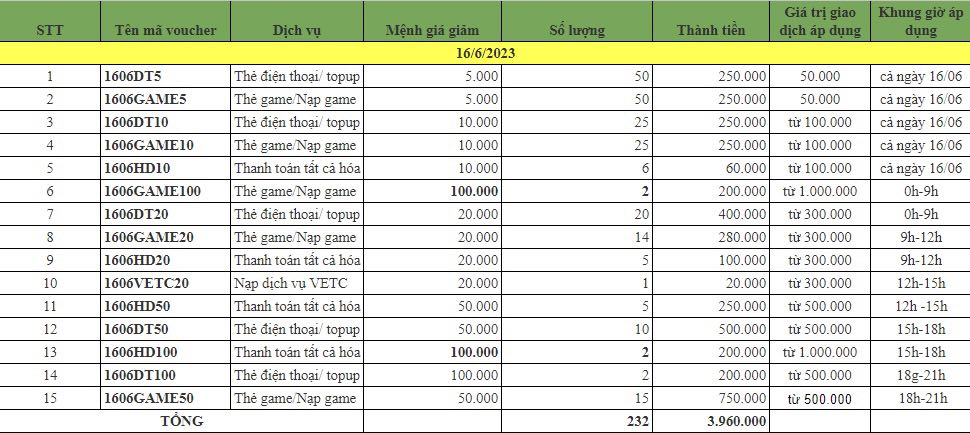 Chi tiết chương trình: Trong ngày 16/06, quý khách hàng sử dụng các dịch vụ của Ví VTC Pay sẽ nhận được những mã giảm giá cụ thể như sau: