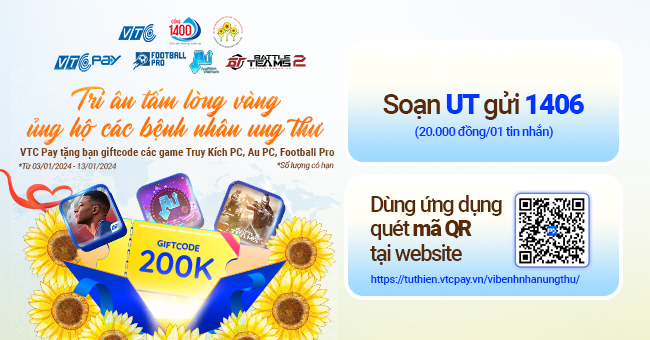 Đồng hành cùng giải đấu Sinh Viên, VTC Pay, Cổng 1400 và Quỹ Hỗ trợ bệnh nhân ung thư Ngày mai tươi sáng mong muốn lan tỏa tinh thần tương thân tương ái đến các bạn game thủ và sinh viên. Để tri ân những tấm lòng vàng, VTC Pay tặng bạn giftcode 𝟐𝟎𝟎𝐊 các game Truy Kích PC, Au PC, Football Pro siêu hot khi tham gia ủng hộ từ thiện