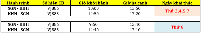 Riêng ngày thứ 6 trong tuần, thời gian xuất phát và hạ cánh của hai chuyến bay này sớm hơn 10’ so với các ngày còn lại. Cụ thể, máy bay mang số hiệu VJ886 sẽ xuất phát lúc 9h50’ sáng tại Sài Gòn, hạ cánh lúc 13h40’ chiều cùng ngày tại Cao Hùng, và máy bay mang số hiệu VJ885 sẽ xuất phát lúc 14h40’, hạ cánh lúc 17h10’ cùng ngày. Áp dụng theo giờ địa phương.