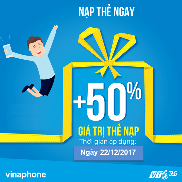 Vinaphone khuyến mãi 50% giá trị thẻ nạp không giới hạn ngày 22/12/2017 là tin tốt lành mà bất cứ thuê bao trả trước nào cũng đang mong đợi. Khuyến mãi lần này áp dụng cho tất cả khách hàng thông thường nạp thẻ, không giới hạn mệnh giá, hình thức nạp tiền nên quý khách sẽ dễ dàng có một tài khoản khủng để sử dụng trong lễ giáng sinh và những ngày còn lại của tháng 12/2017 này.