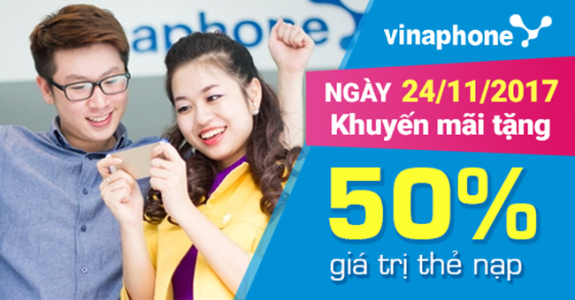 Chương trình khuyến mãi 50% giá trị thẻ nạp Vinaphone ngày 24/11/2017 đem đến cho tất cả các thuê bao Vinaphone trả trước cơ hội nâng cao số dư tài khoản cho dế cưng với những khoản chi phí tiếp kiệm nhất, nạp thẻ ngày vàng để gia tăng tài khoản hoạt động mà bất cứ thuê bao nào cũng không bỏ lỡ mỗi tháng.